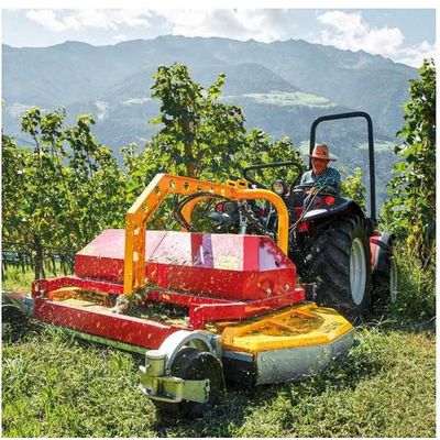 A unique heavy duty Kirkland swing arm mower, specifically designed for use around table top legs and other similar uses. The arms are retracted by hydraulics but operate manually around the table top legs for simplicity and long life. This enables the machine to be used on tractors with low hydraulic oil flow.