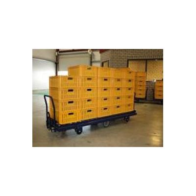 Harvest trolley for over heating pipes in the greenhouse. Toepassing: This trolley is designed for transporting plastic cucumbercrates size LxBxH = 500x400x195mm. Werking/ functie: Can be linked to form a train. To be pulled to the processing room.