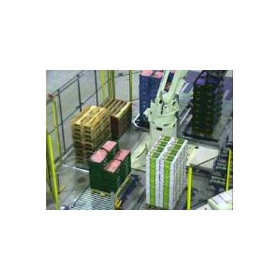 This machine can stack boxes and crates in different pattern on different pallets. Toepassing: Horticultural, Industrie, Logistics, Foodprocessing. Werking/ functie: The robotic arm is equiped with our high tech gripper . This gripper takes boxes, crates, pallets, carton layers.