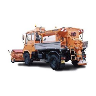 Receiving hopper for spreadings is solved according to allowed load of car chassis or porter. Independent grit sprayer is possible locate to tilting body of car chassis or like brick-box of few bundles receiving hopper. Technologies feeding of material (1 endless screw, endless screws), controled electrical set - semi-automatic machine, automatic, front or backsower. Basic ration between brine and salt is 1 : 3.
