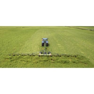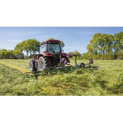 LED light for maximum road safety. Compact V-shaped frame with three-point headstock minimises weight shift from the front axle. Prop stand at the rear and wide storage stand at the front pro-vide good stability and raise the wheels from the ground. Stylish light-weight plastic deck in a sloping design for effective self-cleaning. Headland position pre-setting feature avoids tedding the same area twice for optimum wilting. Auto-folding hoop guards maintain maximum agility also in working Position. Main gearbox with overrunning clutch prevents instant rotor stopping. Mechanical or hydraulic damper struts ensure stable rides and optimum spreads. New KRONE OptiTurn tines lift and spread the crop in an ideaal way. Gauge wheels run close to the tines providing exact tine control and optimum forage quality.