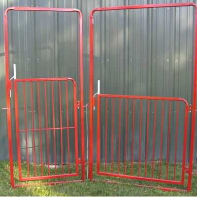 Gates utilize 1” square, 16-gauge tubing and features radius corners for added safety. Rods are 3/8” diameter and welded on 3” centers. Gates are in a 1 1/4” square, 14 gauge tube frame measuring 77” tall. Gates are available in two heights, 40” or 48” tall, and a horizontal support rod is put on all gates at 24” off of the ground for added support. A great versatile choice for penning lambs, goats, and hogs.
