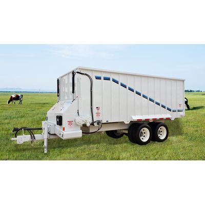 21 "Wide Belt Discharge. 7FT Wide Inside. 5FT Walls (6FT walls on model AC-1406). Discharge Belt Driven by Tractor PTO. Hydraulic Gear Box Driven Floor Chain Powered by Tractor. Manual Flow Control for Floor. Dual Apron WR78 Big Barrel Floor Chain with Double Center Adjustors. Hydraulically Driven Door. Single Axle with (2) 385/65R X 22.5 Super Single Tires Without Suspension. Paint - White with Blue Trim.