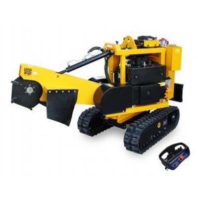 Stump cutter on tracked chassis with remote control. Our stump cutter P 38 R - EFI is designed for cutting of above- and under-ground stump parts. Max. stump diameter to be cut is in fact unlimited. Thetracked chassis is wheel-track-adjustable. Its low centre of gravity provides high stability of the machine also under worse field conditions with maximum work safety. Minimum track base makes also limited spaces and narrow sites more accessible. It can even pass through a narrow garden gate only 70 cm wide. Its hydraulic control and remote controller facilitate any handling at work and make manual labour much easier. This machine is powered by a 35 HP petrol engine.