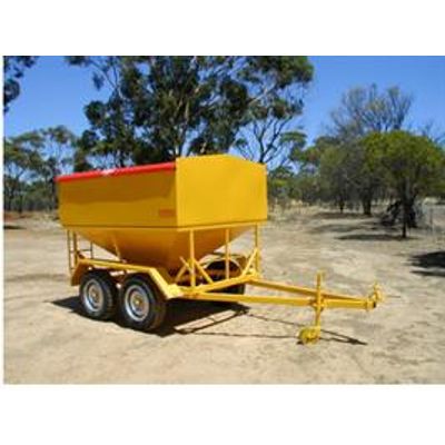 McDougall Weldments offer a variety of trail feeders from 10 bags to 45 bags. The 10 bag to 25 bag has a single axle with a pull cord lever for operation. Roll tarp can be purchased as an extra if required. We have a 45 bag feeder, with a division in bin available. This is a tandem axle feeder with a roll tarp and a 6.5hp motor. An unloading auger can be added on the 45 bag feeder with a choice of the positioning, eg. rear or side.