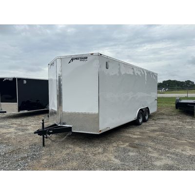 Heavy duty, all steel box frame. Tubular steel walls and roof structure. Aluminum exterior with baked enamel finish. One-piece aluminum roof. Rear ramp door. Single side door. D-Ring tie-downs. EZ Lube axles. 2k top wind jack. 2 5/16" coupler. Breakaway battery and switch.
