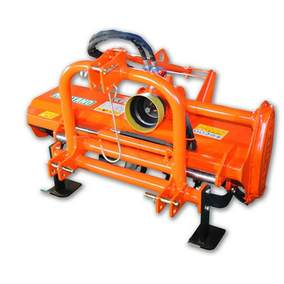 Rotary tillers with hydraulic or manual lateral movement for tractors from 20 to 45 HP -from 15 to 33 KW. For both the version: with hydraulic lateral movement and with manual lateral movement, sliding is always on chrome stem with low coefficient of friction guide. The right side of these machines is rounded to permit at the operator of work near at the tree without damaging them. On request is possible to assemble the 4 speed gear box in a central position. Lateral dive is with gear. We project and realise ours rotary tillers with diligence to ensure a product that needed a minimum maintenance and a long life.