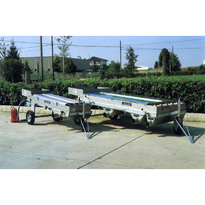 Belt elevator conceived to transfer fish from the ponds to truck containers. Filled up by fish pumps or by hand. Produced in many models but here below you can find only two of them. Chassis built in hot galvanized steel adjustable in height and sloping, equipped with two wheels and a shaft to move the machine easily all over the fish farm. With silent electric engine and electric panel. Rubber belt type 200/2, closed as ring, with hot vulcanization cups.