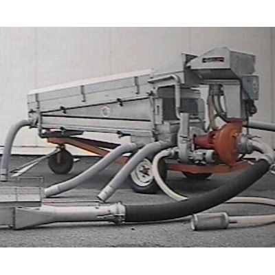 This tank has been conceived to transport fish inside of a fish farm from one place to another. It is equipped with oxigenation internal system that suckes air from outside, little window to check quantity during sucking operations, cock to insert disinfectants, mechanical braking system and vacuum pump linked to an hydraulic distributor with 4 levers. Fish is sucked trought an upper pipe diam. 190 mm placed on the top.