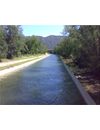 Trapezoid channel 7.0 x 3.0 m (w x h). Partially filled. Concrete channel bottom, embankment reinforced with water engineering stones. Upstream adjustable water separator.