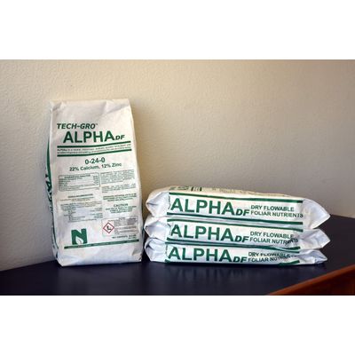 AlphaDF™ is a neutral, micronized wettable powder formulated with excellent dispersion and wetting characteristics for use as a foliar spray. It can be used anytime during the growing season. Early season applications influence bud vigor and fruit set, contributes to higher yields, and improves quality of crop. SimplyFLO safens our high analysis formula and improves spray tank compatibility, even with spray oils. If visible residue is a concern, do not apply 3-4 weeks before harvest.