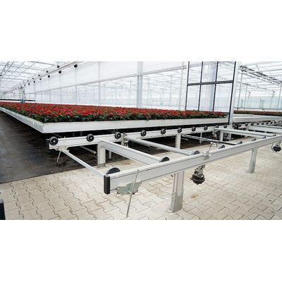 Our mobile and rolling mobile bench system was especially developed for large horticultural establishments, in which benches with plants have to be moved at regular intervals in a time saving and cost saving manner. Mobile benches are a precondition for the automated processing of plants. The benches (also called containers) run on four ball bearing mounted metal rollers. Highly stable tubing serves as runners. With the exception of the transport passageway and the working area, the entire greenhouse area is thus available. The benches can be moved either by stationary rail transport systems or fully automatic transport robots. As a bench coating, one can choose between closed or holed Styropor (for mat watering), aluminium or plastic baths (for accumulation watering) or galvanized corrugation.