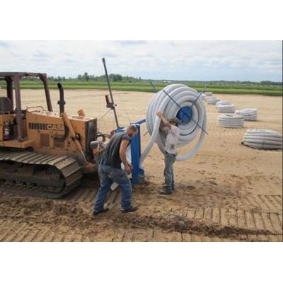 Custom Sized for Your Dozer Blade. Carries 250 ft. Roll of 4" Drain Tile. Roll is Offset to Side for Visibility. Mounts Via Two Tabs Welded to Back of Blade.