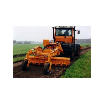 Completely hydraulically controlled for road building and maintenance, grading, landscaping, backfilling and ripping. The POMA - Grader AG 225 is a most modern, very strongly built piece of equipment for all kinds of grading jobs for contractors, forestry and communities. Adjustments are made with electro hydraulic-valves. Joy-stick-levers inside the tractor cabin help to handle the unit highly comfortable. The offsetting the grader to the right or left prevents the tractor being taken out of the track and also allows working close up to the walls and ditches. The support wheels set far to the rear always run in the track of the grader blade. Rippers and side-blades are useful for road-maintenance work. For turning and transportation the grader is lifted through the tractor 3-point hitch.