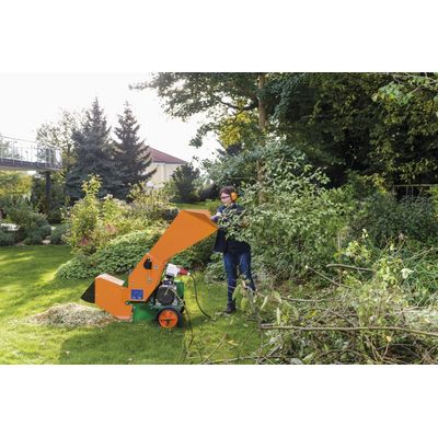Our wood chopper for your garden provides fine chopped wood for your personal compost heap. This garden chopper is suitable for optimal compost processing and quick chopping of brush, shrubs, wreaths, garden and sawmill residue. The spring-loaded feed chain with overload protection automatically and continuously transports the material to the mallet drum. 27 rotating mallets smash it into pieces and so ensure improved defibration and consequently quicker composting. The flails of the garden chopper can be used twice standard and last twice as long.