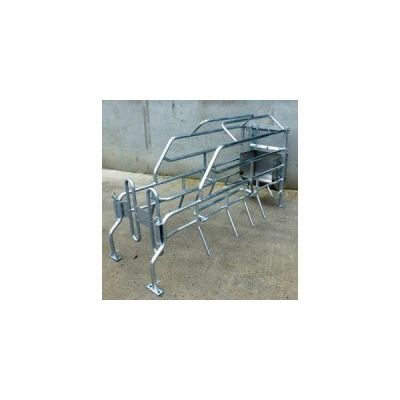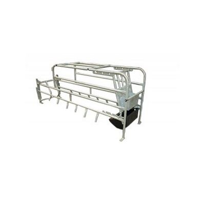 Can be opened to allow the sow freedom of movement, Heavy galvanised construction, Piglet saver bars, Adjustable width, Reversable back door, Stainless steel standard trough or combined feed/water trough