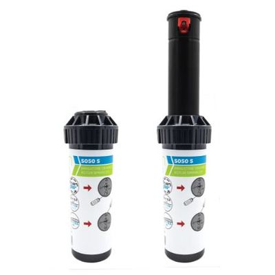The S050 S rotary sprinkler meets the needs of the installer with its patented ARC SET DEGREE angle adjustment system that saves up to 75% of the working angle adjustment time. It features a wide range of interchangeable nozzles that allow great flexibility for irrigating small areas.