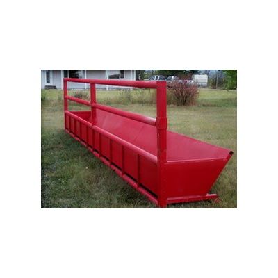 Heavy Duty Feed Bunks with a triple weld center splice. Designed with a flat bottom and sloped sides. Water drain holes on both ends. Fill capacity of 55 cubic feet in standard bunk. Outside mounted legs allow for stacking bunks. Legs are strong and made with 3/16 4x6 rectangular tubing. These can be painted or unpainted. 22 ga Steel Trough.