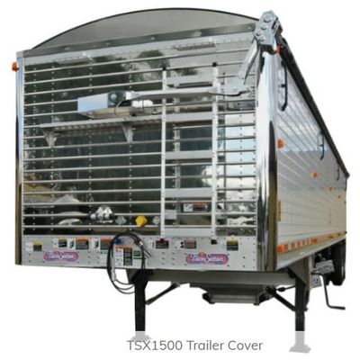Our TSX1500 trailer cover system with Rite·Lock™ Technology for agricultural trailers features a dual-arm power kit including “Lock-Down” accessories. Ideal for Solid Tarpaulin (sealed) applications. Enhanced dual arm system features Rite·Lock™ power kit combined with our MultiFlex™ rear cable arm allows full operation of all tailgates.