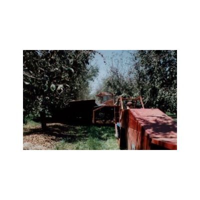 This is a model 788 harvesting prunes in for the 1995 season. A model 588 Schieler Harvester Bin Carrier is seen in the foreground with Nick Schieler on the operator`s platform, waiting to service bins to the harvester.