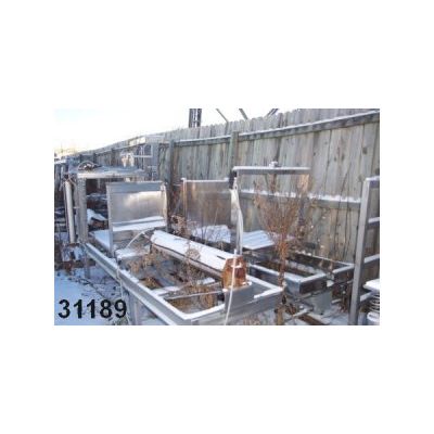 Custom Built, 640 pound Block Cheese Cutter all stainless steel, 2 cutting operations to produce 40 pound blocks, dimensions are 10` 8` long x 48` wide, cutting frame measures 38` wide x 32¾` high, for use with variable sized cutting harps, horizontal cutting head is powered 8` diameter x 48` long air cylinder mounted on upper side of machine. Machine has a second cutting frame powered by dual air cylinders for vertical split 14` back from first cutting frame.