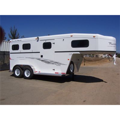 2014 New Charmac Lariat aluminum 2-Horse bumper pull slant load, 7000# GVWR (payload 3730#). Triple wall construction, 7'6" tall x 6'9"' wide with 48" stalls, stainless nose wrap, one-piece aluminum roof, floormats, heavy duty drop down feed windows with travel bars, stall padding, double rear doors with windows and locking cam latches, spare tire, LED lighting, outside halogen load lights, rubber on all horse area walls, roof vents, bus windows on curbside, adjustable swing out saddle rack, corner water tank, blanket bar, rubber bumper, dome lights, carpeted tack wall, 14x14 roof vent in dressing room, rubber torsion axles, radial tires, graphics package. 7-Year Warranty. VIN #4RYL162B3ET113845.