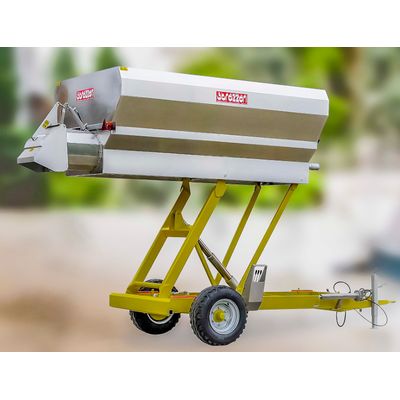 GRE - Liftable trailer for grapes, with auger and door for discharge. Equipped with a frame for lifting of the container, which allows discharge at 2.15 m of height. The rear movement of the container, during lifting, facilitates positioning of the discharge on the crusher avoiding inconvenient manoeuvres with the container raised. The particular construction of the container, with asymmetric walls, avoids the `bridge` on the auger facilitating descent of the grapes.