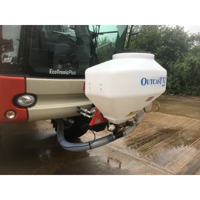 The Outcast Duo is a twin spinning disc applicator. It is designed to fit on to the flat bed of a utility vehicle, like a Gator or Mule. It spreads to a distance of 24m and at typical forward speed of up to 15kph. The control system uses GPS speed sensing and pellets are metered onto each spinning disc so that you can be assured that your application is uniform and accurate. The Outcast Duo can be fitted to the front or rear tractor linkage or fitted to the front of a 24m sprayer.