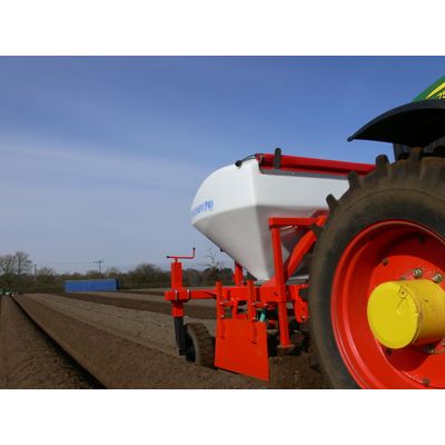 The Maxicast is principally a nematicide applicator for 3 bed tillers. The mounting can either be front or rear as the product delivery point. The hydraulic fan is capable of blowing nematicide product from the front to the back and evenly distributing across a width of up to 6m. In the pictures on this page it is being used to apply Nemathorin on Potato beds. We built these units for a customer who specified that the Maxicast would connect to their tractor via ISO bus and by using 2 metering units we could use 1/2 width shut off. ISO bus enabled the field map data and forward speed to directly operate the Maxicast allowing for variable rate and headland control. It can also be used to apply cover crops by simply changing the metering cartridge.