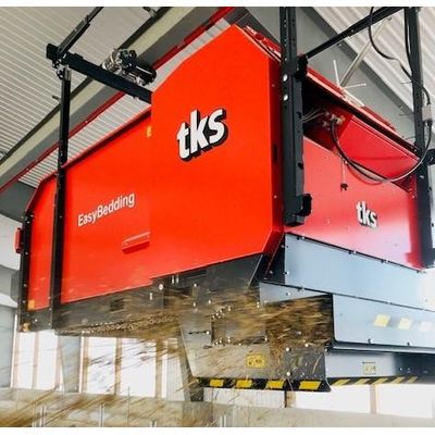 TKS EasyBedding is designed for automatic bedding of straw, hay, sawdust, wood chippings for resting areas for livestock. EasyBedding is a specially designed machine for bedding of loose material for resting areas for Dairycows, cattle, sheeps, goats etc. Increased focus on animal welfare makes the interest for bedding much higher. Our system can handle drymatter roundbales/squarebales with straw or hay directly. The material is shredded/cut and then spread out up to 10m width. Also loose material such as woodchippings, sawdust etc. can be spread out. Built on the same basis as the Combicutter and EasyFeed, but is equipped with an extra rotating drum, and then the spreading discs. The machine can load automatically from a R2 reservoar, and runs on a monorail-system over the stalls and animals.