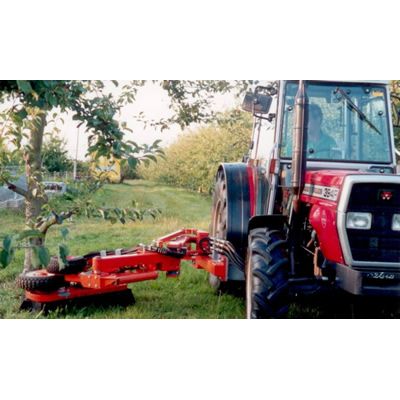 Tuthill Centipede side sweep is mid-mounted on the tractor and moves fruit from between the tree trunks and into the row ready for the harvester to collect. It is clears the fruit very efficiently from between the trees. The Centipede side sweep eliminates the need for a blower.