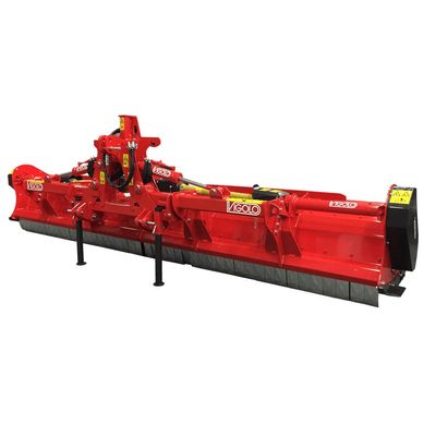 3 points ISO universal reinforced hitch with 2nd category oscillating fork (pins of 2nd/3rd cat). Transmission with one speed lateral gearboxes 1000` mod. Vigolo A8. Transmission body by case-hardened and hardened gears. Endplates with height-adjustable shock absorber. Rear levelling blade mounted on roller. Lateral rear roller adjustment by pins. Locking safety system in closed position with automatic sequential release. Central cardan shaft with disk clutch (tractor side fork 1” 3/8 Z6) - Shear-bolt protected side cardan shafts. Rear light kit with road travel tables kit. EC guard kit.