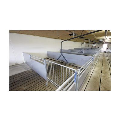 The mating stall is designed so that it provides ample space for both the sow and the staff while facilitating a strong stimulation of estrus and high reproduction performance. The stall is made with saloon gates making it easy to move the gilt or sow into the stall, while the staff can enter the stall without opening the gate. The stall design allows implementation of either a poly trough or a stainless suspended trough. The stall is standard with prefabricated bars in front but can also be fitted with a front gate. The stall is galvanized and with solid legs. Stainless steel fastening secures a long durability of the stall.
