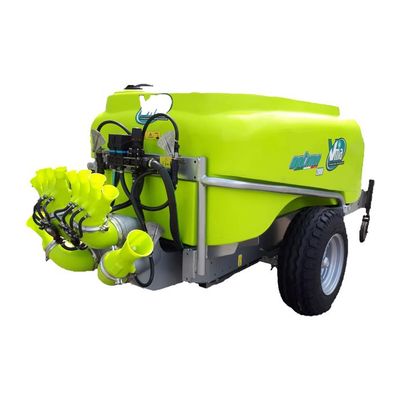 Stainless Steel Range for Tractors ≥ CV 75 - 55 KW. Basic standard equipment with: Hot galvanized sheet steel frame predisposed for steering drawbar. High density polyethylene tank complete with level indicator, product mixer and can washing, handwashing tank and circuit washing. Pressure gauge and pressure regulator. 2 solenoid valves with electrical remote control. Litre-counter dispensers with graduated scale in stainless steel for each sector. Fan housing made of steel. Mechanical step-up gear with oil-bath gears and 2 speed gearbox. Disengagement and centrifugal clutch on the fan shaft. Self-priming stainless pump with automatic belt tensioner, flow rate 200 lt/min.. Centrifugal closed blade fan in sheet steel Ø 550 mm, air volume up to 18000.