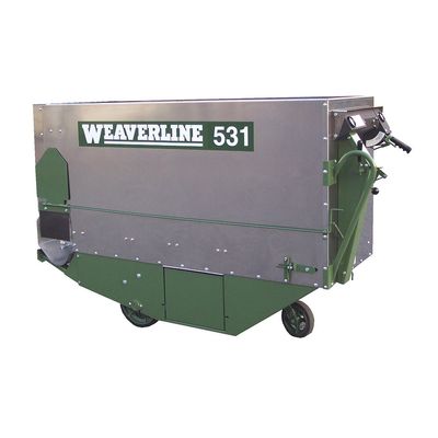 Battery power and stainless steel are two well-known features of the Weaverline feed carts. Efficient electric power provides smooth, quiet operation with no toxic fumes. The high-speed discharge and fast apron speeds cut feeding time, unloading the 31-bushel cart of corn silage in 35 seconds. Hydrostatic drive gives you fingertip control of the cart in either forward or reverse. The stainless steel box section and stainless steel augers greatly increase the life of the cart. The all stainless steel conveyor system in the series 5 carts is comprised of the stainless gap-link chain, stainless steel sprockets, and stainless steel slats. The gap-hook chain design allows the slat to be fastened around the side bar of the link, thus avoiding the stress points of other types of attachment. The chain is self-centering on the narrow stainless steel sprockets which results in an extremely easy running, low wear conveyor system.