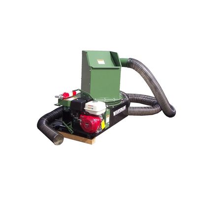 The KB1255 with the 13 HP Honda makes quick work of straw at less than 60 seconds per bale. The adjustable grate has six settings to control output and cutting length. The carrier for the extra bale folds up when not in use. A plastic top overlay and the adjustable plastic wear strip found on all Weaverline choppers helps eliminate any binding caused by the material being chopped and is very important when chopping newspaper. Economy models with a single swivel wheel and a 9 HP Honda or Briggs & Stratton are available as well as units with an electric motor. A bottom discharge model for mounting over a conveyor system leading to a T.M.R. mixer is also available. The aggressive 76-Knife rotor with a spiral design assures an even power curve for uniform continuous cutting with less horsepower. This rotor, with its double V-belt drive for efficient transfer of power, is the heart of the high-capacity Weaverline Bale Choppers.