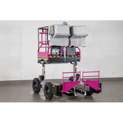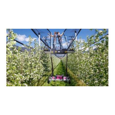 Our K4 is a cost-efficient general-purpose platform for your family business. It is compact, agile and functional, and can support you all year round in your work: tree pruning, thinning by hand, or working on hail nets, ensuring that harvesting is completed comfortably, quickly and with maximum care. The K4 has a unique patented harvesting system. The picking baskets for the upper areas are automatically lowered and emptied into the crates from above. This means that up to five persons can comfortably pick fruit at the same time using the K4 in both the upper and lower ranges. The empty picking crates are either distributed separately along the rows, or up to five crates can be carried by the machine during harvesting. Easily mountable booster batteries double the autonomy when working on hail nets or when hanging up dispensers. The K4 general-purpose platform can be transported directly using the tractor hoist or with a stacker when harvesting.