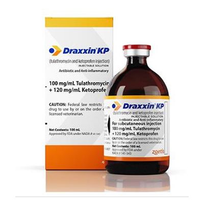 For cattle producers, DraxxinKP (tulathromycinandketoprofeninjection) Injectable Solution is a one-shot combination that provides fast-acting control of fever (pyrexia) associated with bovine respiratory disease (BRD) and long-acting, demonstrated, antibacterial activity against the four major BRD pathogens, so cattle make a fast BRD recovery. This single dose BRD treatment combines the nonsteroidal anti-inflammatory drug (NSAID) ketoprofen with the antibiotic tulathromycin, the active ingredient in Draxxin.