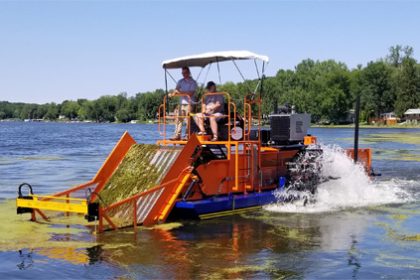 The aquatic weed harvesters are used for establishing things like navigation lanes and clearing out areas of varied plant growth, like impacted boating or swimming areas and the weed harvester can remove a lot of plant material. Alternatives would be more time consuming and expensive!