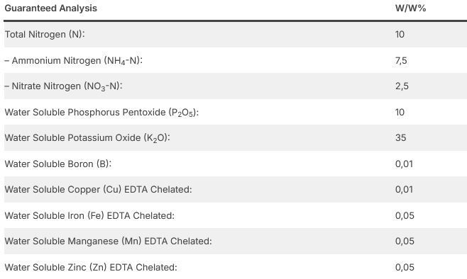 10-10-35+TE NPK fertilizer is a high-performance, water-soluble fertilizer formulated to supply the potassium requirements of plants towards the end of their growth cycle. This fertilizer is enriched with nitrogen, phosphorus and essential trace elements (TE).Most popular related searches