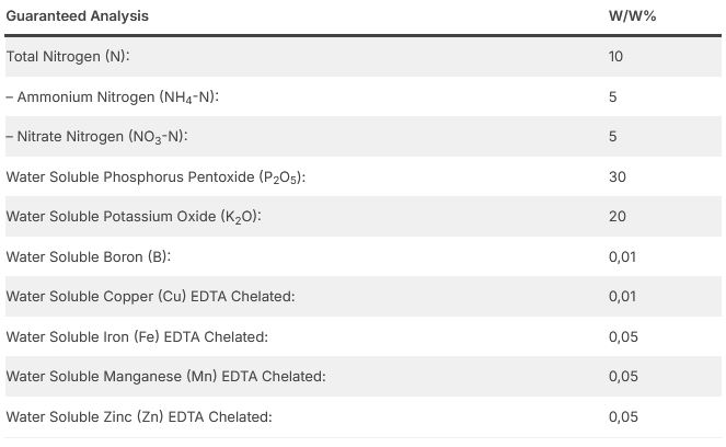 10-30-20+TE is a water-soluble NPK fertilizer formulated to support the flowering period of plants and provide the necessary high phosphorus and potassium along with nitrogen. Enriched with essential trace elements (TE), it provides complete and effective nutrition for optimum plant health, growth and productivity.