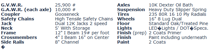 Weight: 7,500 #. Description: 20` Flat + 5` Wood Dove Tail.