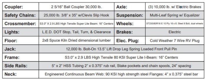 Lockable Front Toolbox, Spring Assist Steel Full Width Max Ramps, Engineered One Piece, Continuous Weld Gooseneck, Engineered Robotically Welded, Continuous Main Beam, Plank Deck, Dual Wheels, Precambered Deck, Low Profile Bed, Pierced-Beam Frame, 25,000 lb. Bolt-on Safety Chains & Hooks, LED Lighting Package.