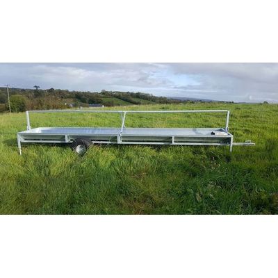 Double sided 16ft feeding trough. Complete with four stabilizing legs when not connected at hitch to prevent tipping. Anti-jumping bar to prevent animal injury which can be lowered flat when not required. Large quad tyres for use in soft ground. 100% hot dipped galvanised. Removable hitch for security. Can be moved by Quad, Tractor, Car or Jeep.