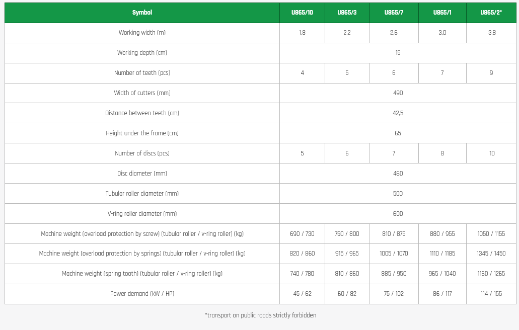 Stubble cultivators (2 rows of teeth) Apus are designed for cultivating fields after maize harvesting, on concise and heavier soils. The machine is equipped with coulters with cutters (width: 490 mm), which ensure a deeper mixing of crop residues with the soil, and the roller (tubular or V-ring) that cooperates with it presses the fluffed soil to the ground.
