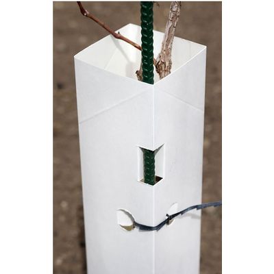 Biodegradable / Recyclable paper plant protectors for use in tree and vineyard propagation. The drop-on protectors are white, poly-coated paper(milk carton-like material) with a 3.75" diameter. They are pre-sealed, with a pop-out stake slot for bamboo or metal stakes and a tie hole as well. Great for vine protection and tree protection. Used to protect plants from herbicide overspray, sun, and wind. Create a micro-environment to support the transition of plants from nursery to field.