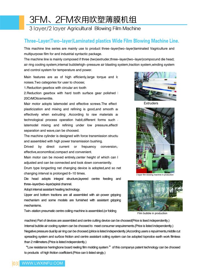 The machine is to produce 3-layer 6-24 meter Agricultural greenhouse film. Film thickness range: 0.06-0.2mm. With special addtional parts, it can also produce PO greenhouse film.