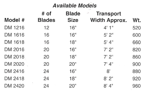 Heavy duty steel frame. 3 x 3 heavy wall steel tubing gang holder. Sealed bearings to insure long life with minimum maintenance. 20` (9 gauge) or 16` (11 gauge) scalloped discs. Easy angle adjustment.