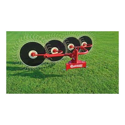 Easy and efficient hay rake, ideal for any type of soil. Raking wheels mounted on double arm with tapered roller bearings improve endurance and durability. Standard raking wheels Ø 145 cm., n° 40 teeth Ø 6.9 mm. All teeth are made of C85 flexible steel and heat-treated