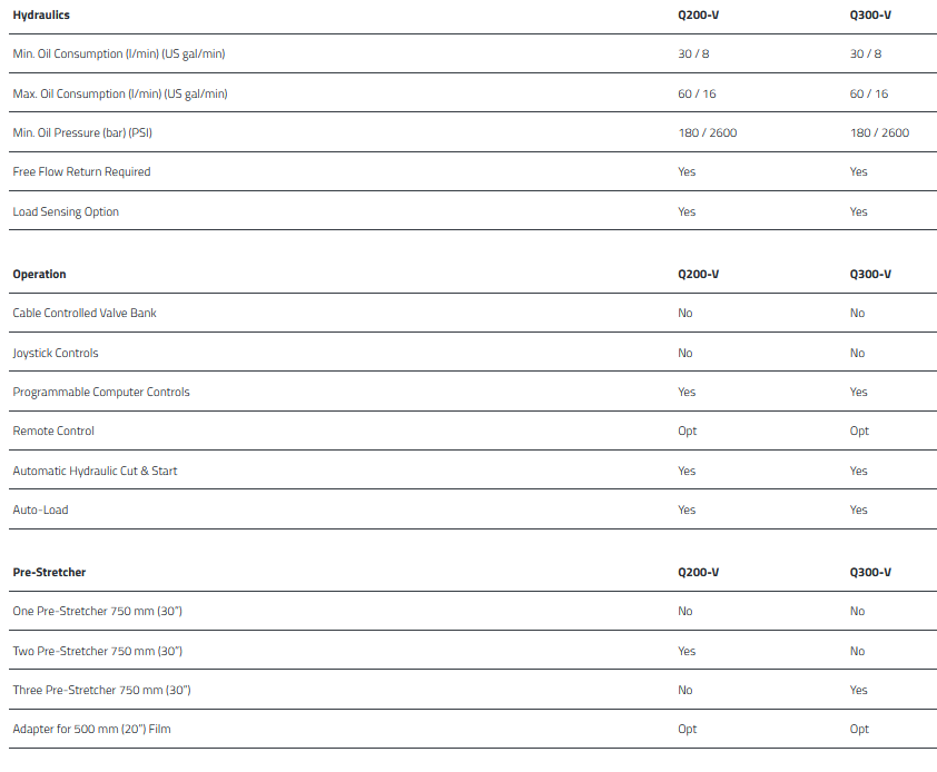 The Q Series which takes its name from Quadrangle, as in four sides, emphasising its focus of square bale wrapping. The Q Series has two models within the range. The Q200-V has twin film dispenser (Q200-V) and the Q300-V has three film dispenser (Q300-V) options. Multiple dispensers Is made possible by the unique patented folding wrap arm mechanism developed by TANCO and delivers reliable speed. Up to 65 and 80 bales per hour, respectively.